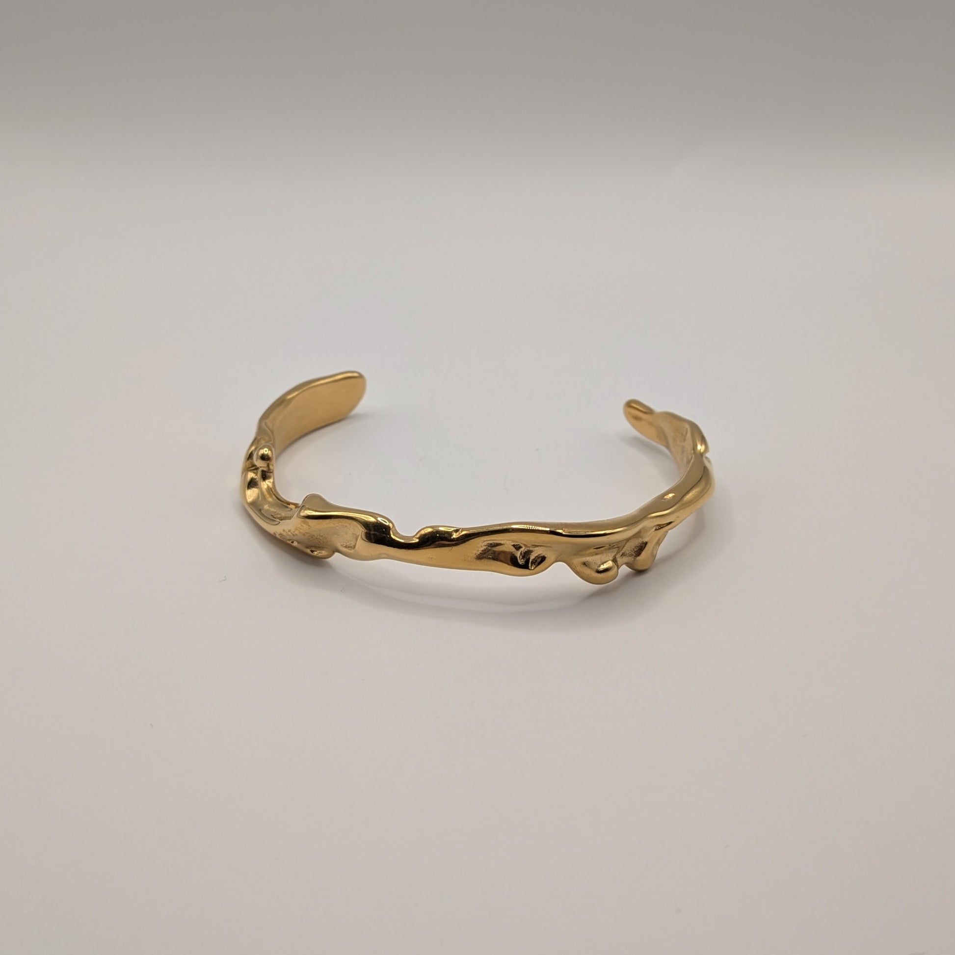 Embrace the art of modern elegance with our Sculptural Molten Gold Cuff Bracelet. This striking piece captures the fluid beauty of liquid gold frozen in time, featuring an organic, irregular silhouette that flows naturally around the wrist.