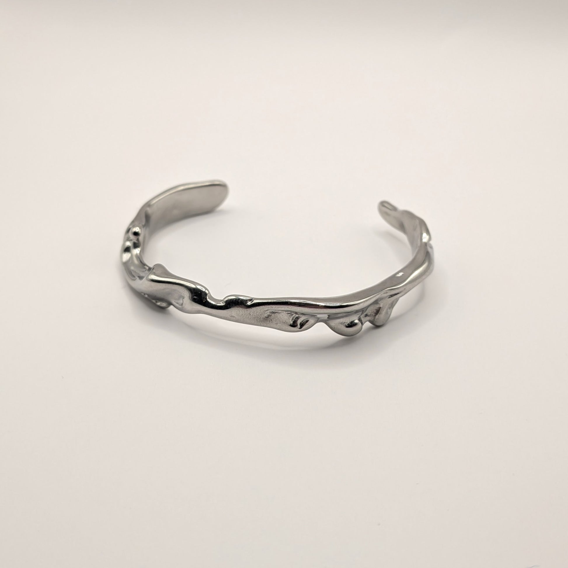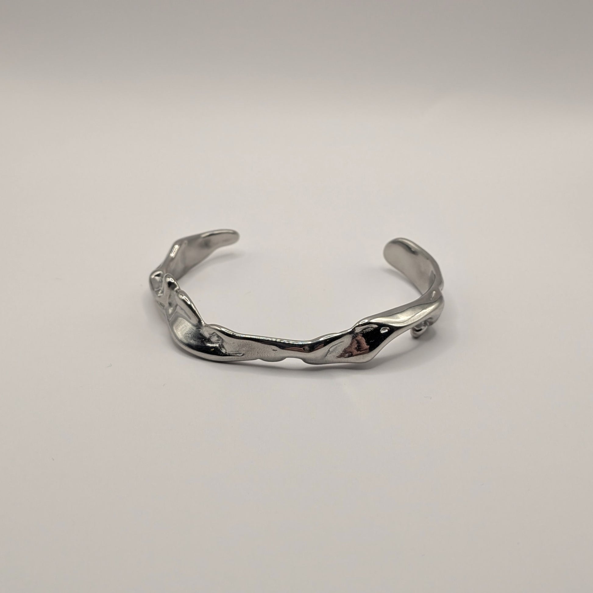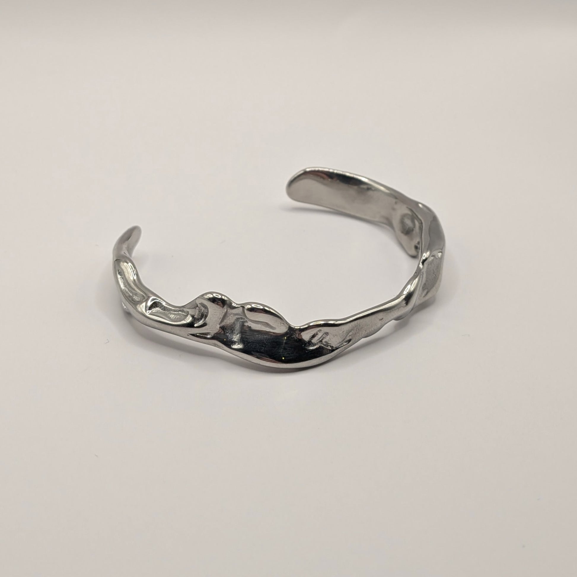 Crafted from premium stainless steel with lustrous silver plating, this statement cuff showcases an artisan-inspired design with hammered textures and undulating curves that catch the light from every angle. The open-ended construction ensures a comfortable, adjustable fit while maintaining its sculptural integrity.
